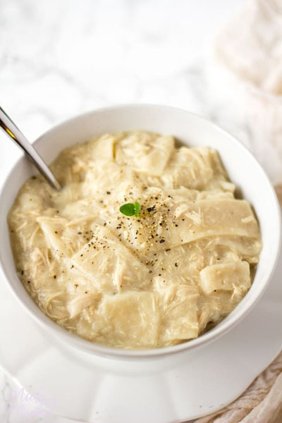 3. Roll the dough out thin with a heavily floured rolling pin. Dip your cutter in flour and cut the dumplings in squares about 2×2-inches each. It’s okay for them not to be exact. Just eye ball it. Some will be bigger, some smaller, and some might be shaped funny.